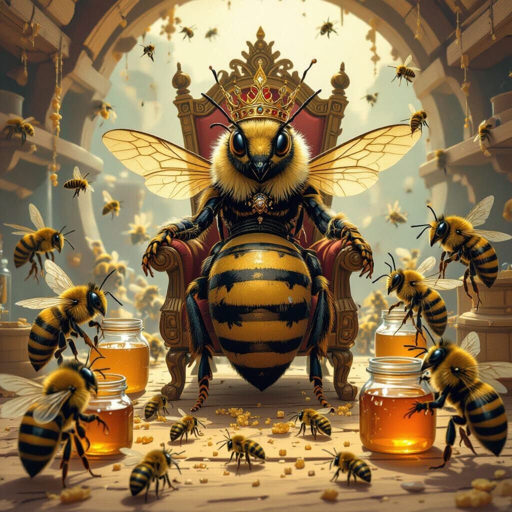 A captivating scene of a queen bee on her throne in a lively hive. Worker bees diligently maintain the space, creating honey in a style inspired by whimsical and industrial art.