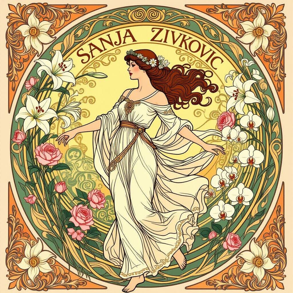This Art Nouveau illustration features Sanja Zivkovic in a graceful pose, surrounded by a profusion of flowers. The artwork showcases decorative, ornate details with soft pastel colors and amber accents.