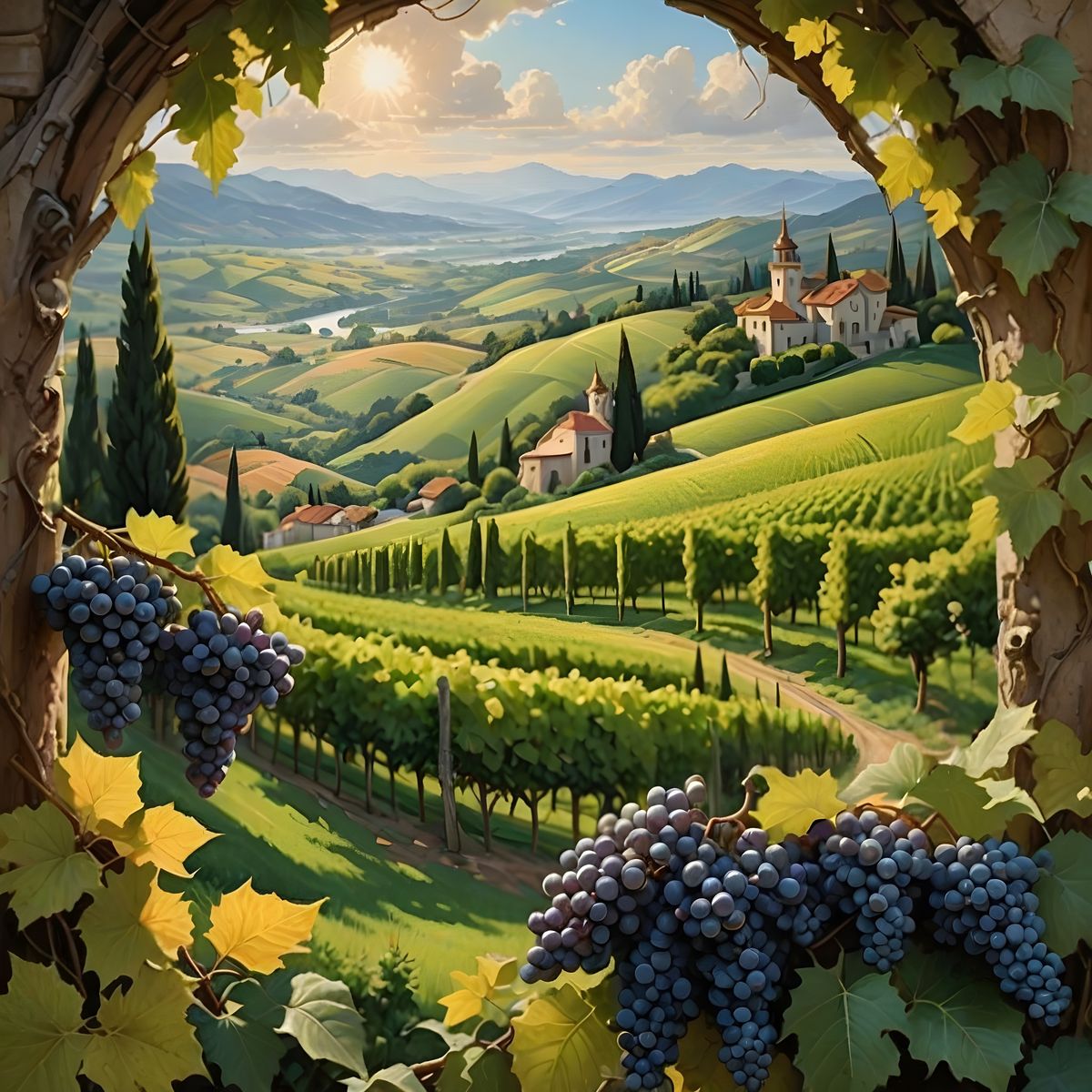 This image shows a scenic vineyard landscape with intricate details of grapevines, lush greenery, and wild flowers, set against a backdrop of a rural landscape with mountains and rolling hills.