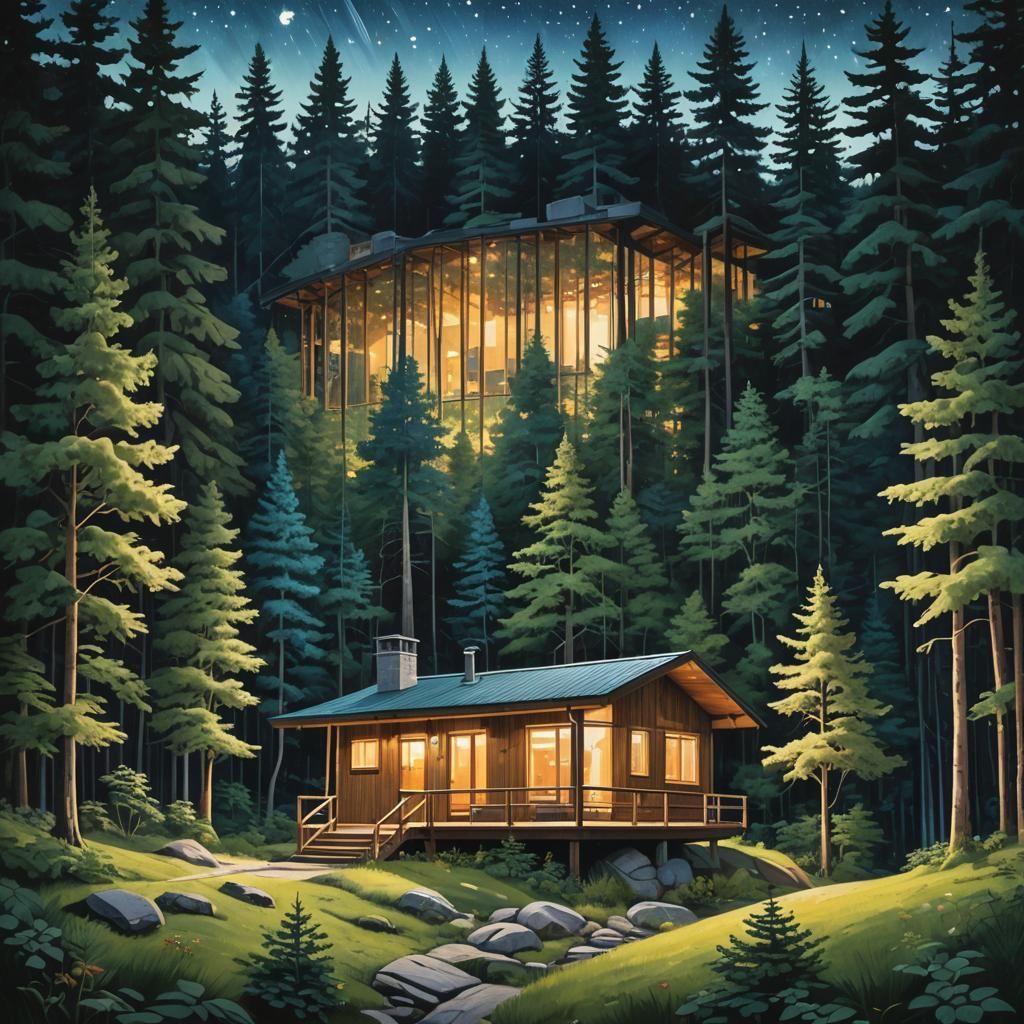 A hyper-realistic image of a solitary mountain cottage in a tranquil forest. The scene, reminiscent of Finnish minimalism, blends summer colors with the warm glow of cabin lights under a starry sky as oil on glass.