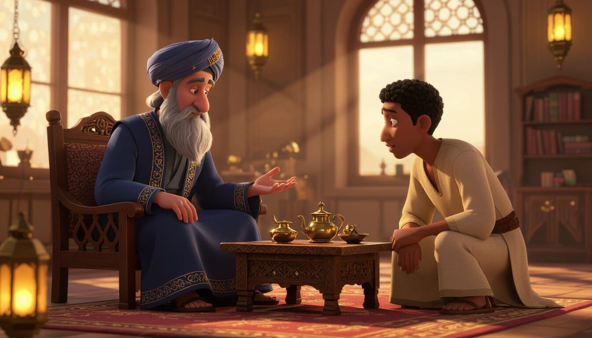 This image shows a scene of the Kind Merchant in gentle conversation with Saad in a warmly lit study, rendered as 3D animation. The aesthetic is reminiscent of a Pixar movie.