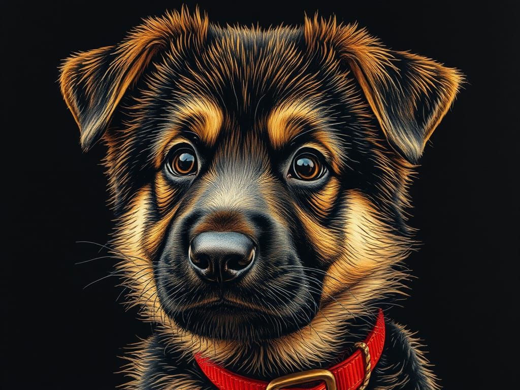 This image shows a close-up portrait of a German Shepherd puppy with fluffy fur and big brown eyes, rendered in intricate scratch art style with fine copper lines on a black background.