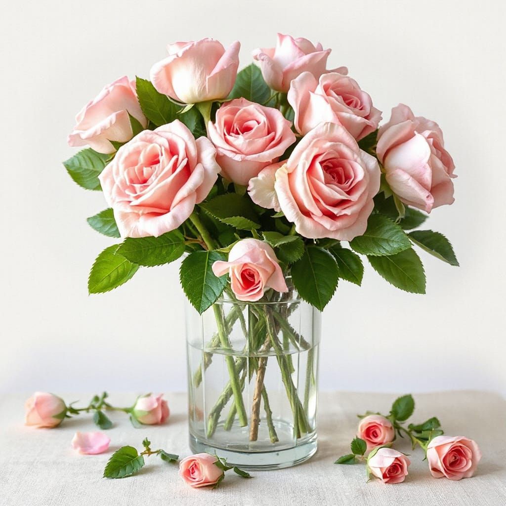 A watercolor painting of roses in a clear vase. The painting displays elegant curves and delicate lines, with soft pink and green hues creating a serene aesthetic.