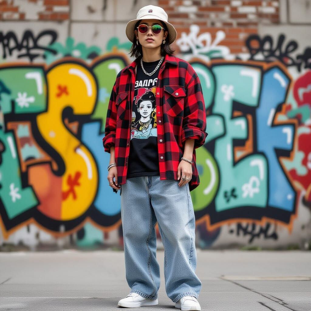 This image depicts a person in an oversized graphic tee with jeans and sneakers, channeling a vibrant, playful aesthetic reminiscent of street art. The outfit is accessorized with sunglasses and jewelry.