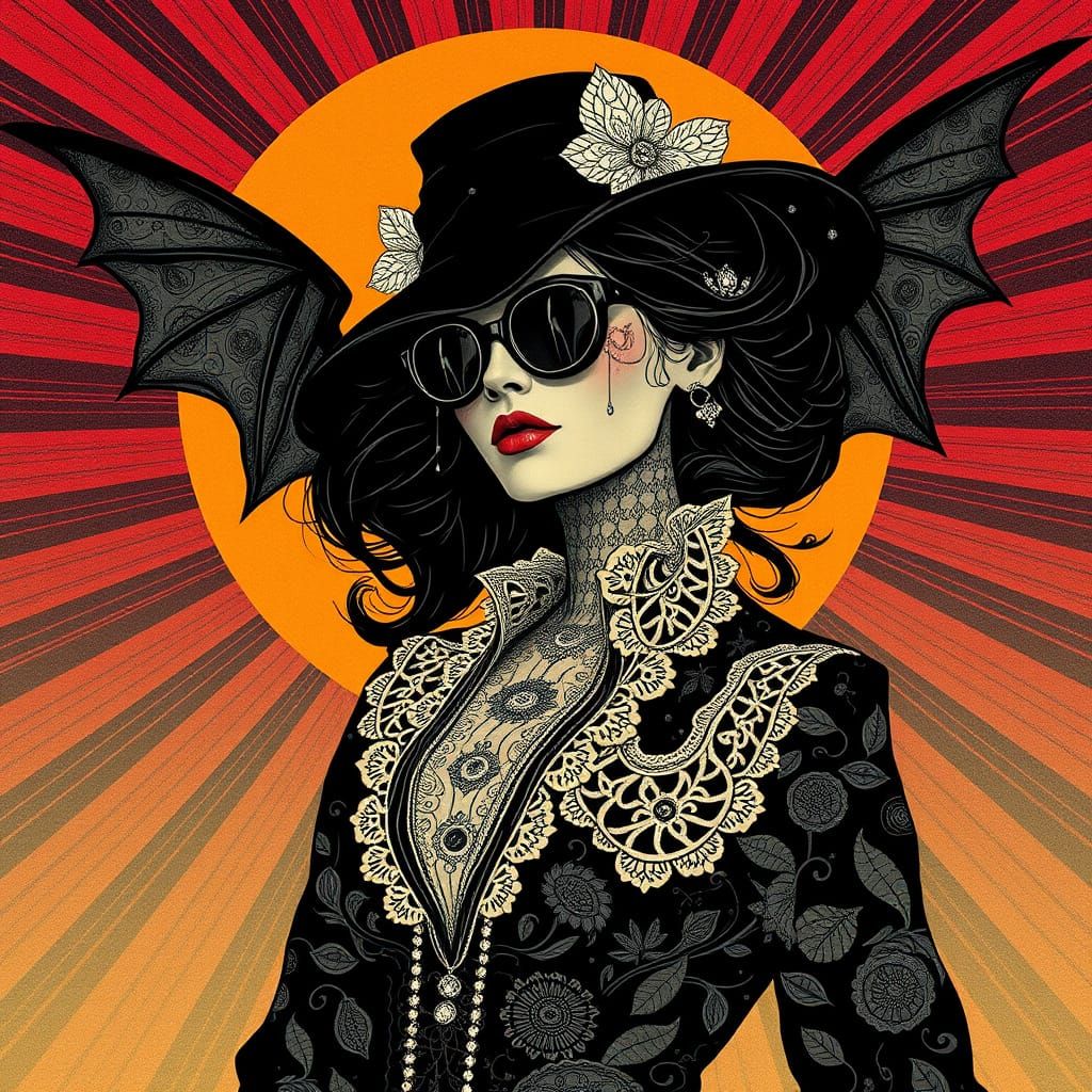 This image shows a woman in a vibrant, surrealist setting, blending organic circuitry and intricate lace with the dynamic energy of cubist art and the sensual curves of Art Nouveau, set against a concentric gradient sunburst background.