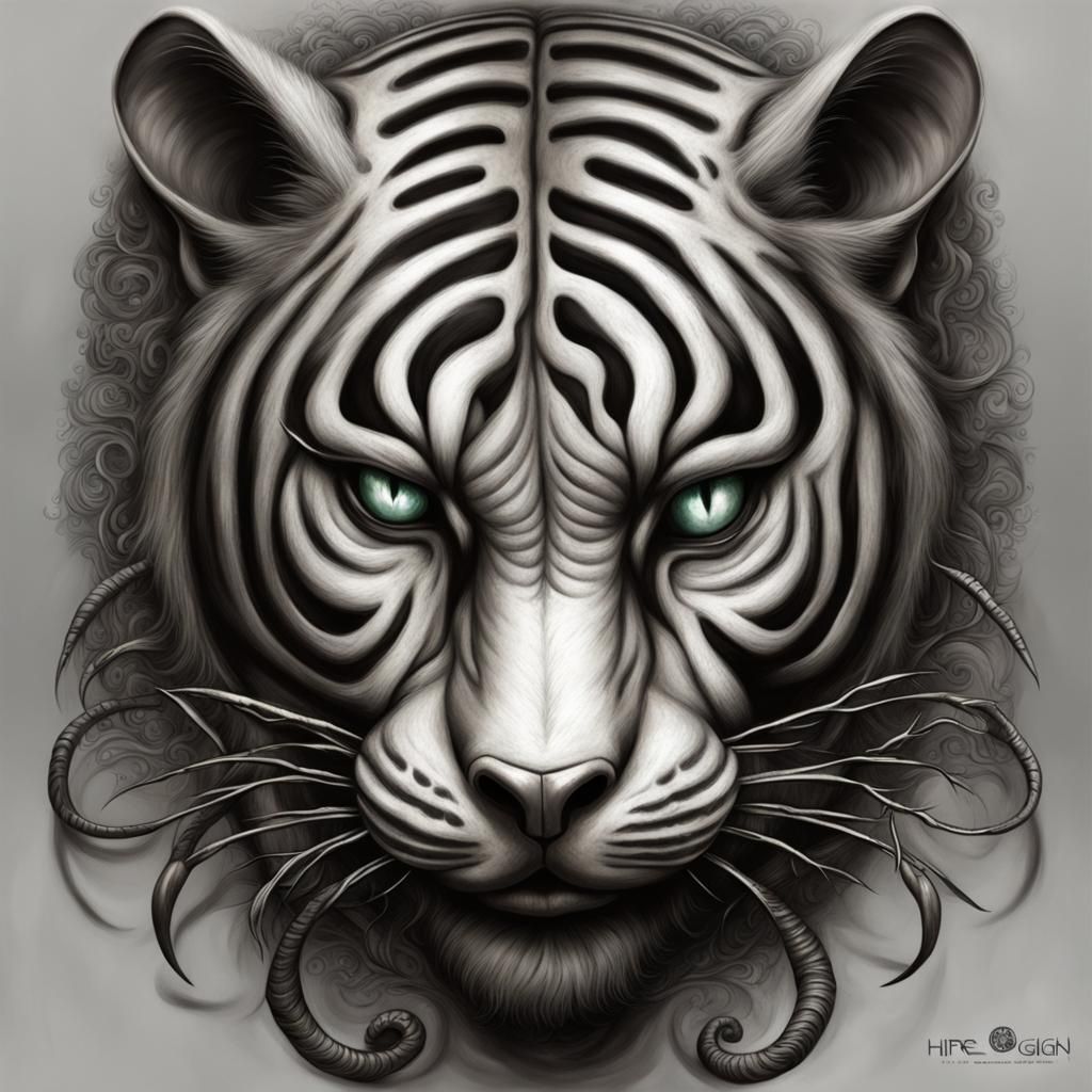 A hyperrealistic image of a tiger, rendered in blacks, grays and metallic shades. The image has a biomechanical aesthetic.