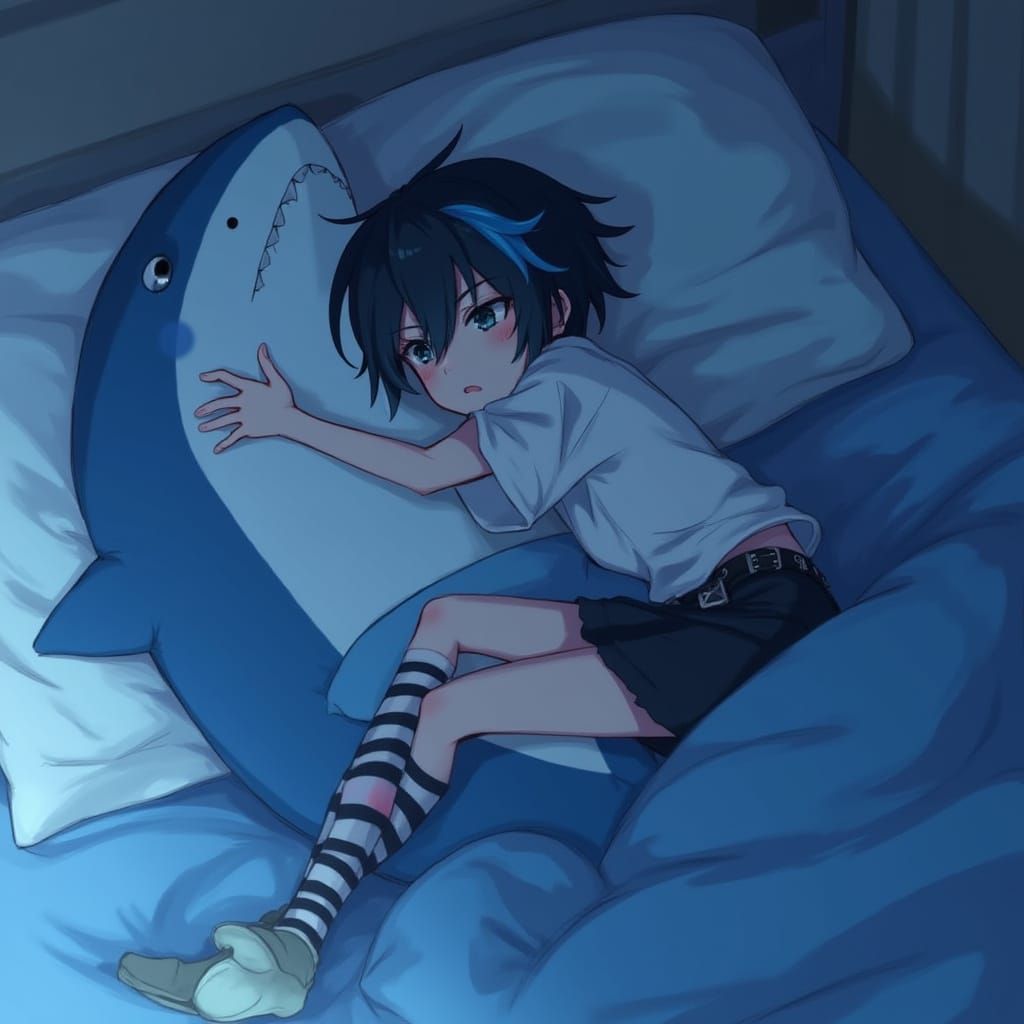 A digital anime illustration of a shy teenage boy with black hair and a blue streak, wearing a mask and skirt, hugging a plush shark on a bed bathed in moonlight. Rendered in a delicate anime style.