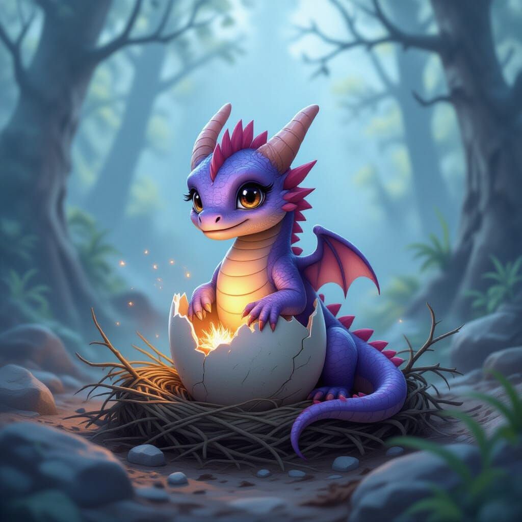 A misty scene shows a purple baby dragon hatching from its egg in a nest. The image features fantastical realism and ethereal atmosphere.