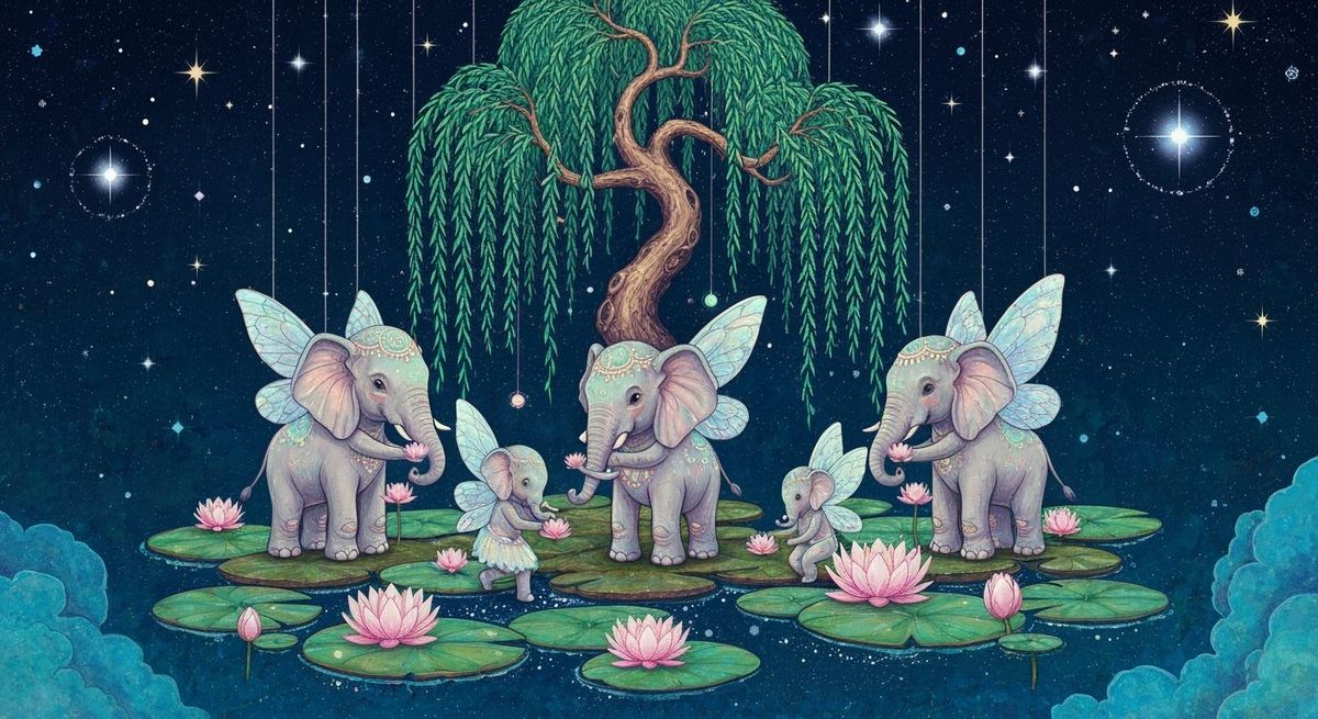 This image shows whimsical elephant fairies feasting on water lilies beneath a floating willow tree. The scene is set against a starry night sky, rendered in a vibrant, holographic style.
