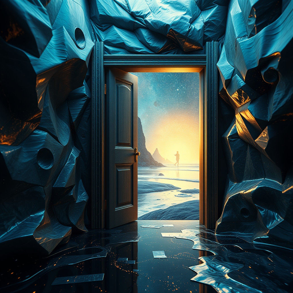 This image shows a surreal, dreamlike scene in a liminal space. A doorway leads to a mirrored timeline, with distorted perspective and iridescent colors, creating a palpable sense of unease.