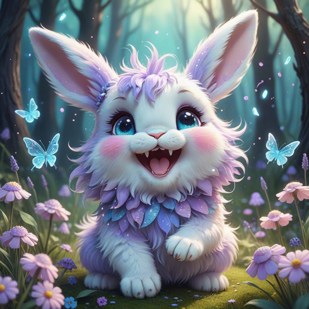 A charming image of a fluffy bunny fairy laughing in an enchanted forest. The bunny has soft pink and white fur and translucent glittery wings, set against magical lighting in soft pastel tones.