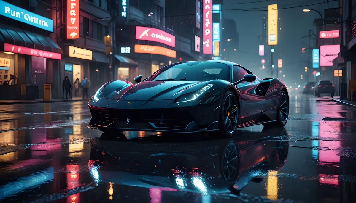 This cinematic image shows a black Ferrari speeding through a neon-lit, futuristic city at night. Rain-slicked streets reflect holographic ads, creating an atmospheric scene of power and ambition.