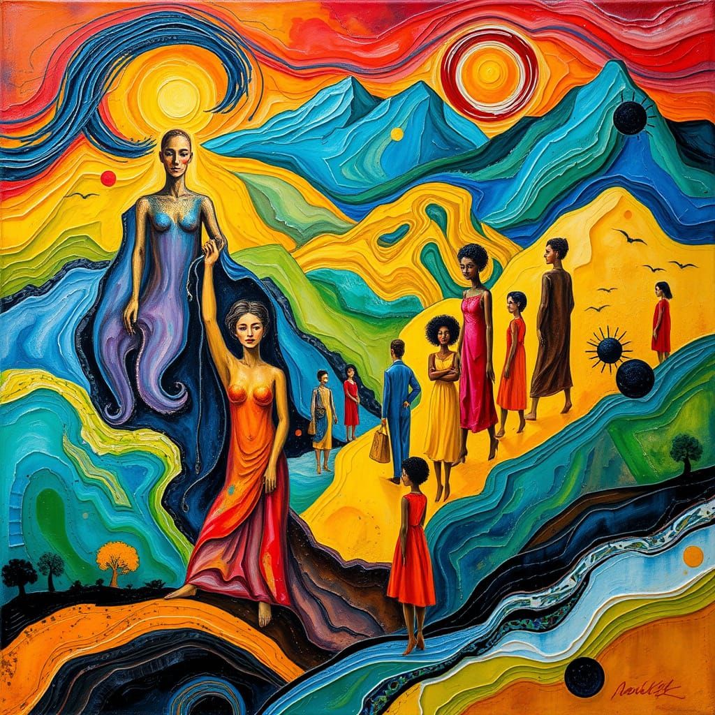 A vibrant gouache painting merging cubist figures with swirling landscapes. Thick, textured brushstrokes and impasto layers create a museum-worthy masterpiece in a maximalist, watercolor style.