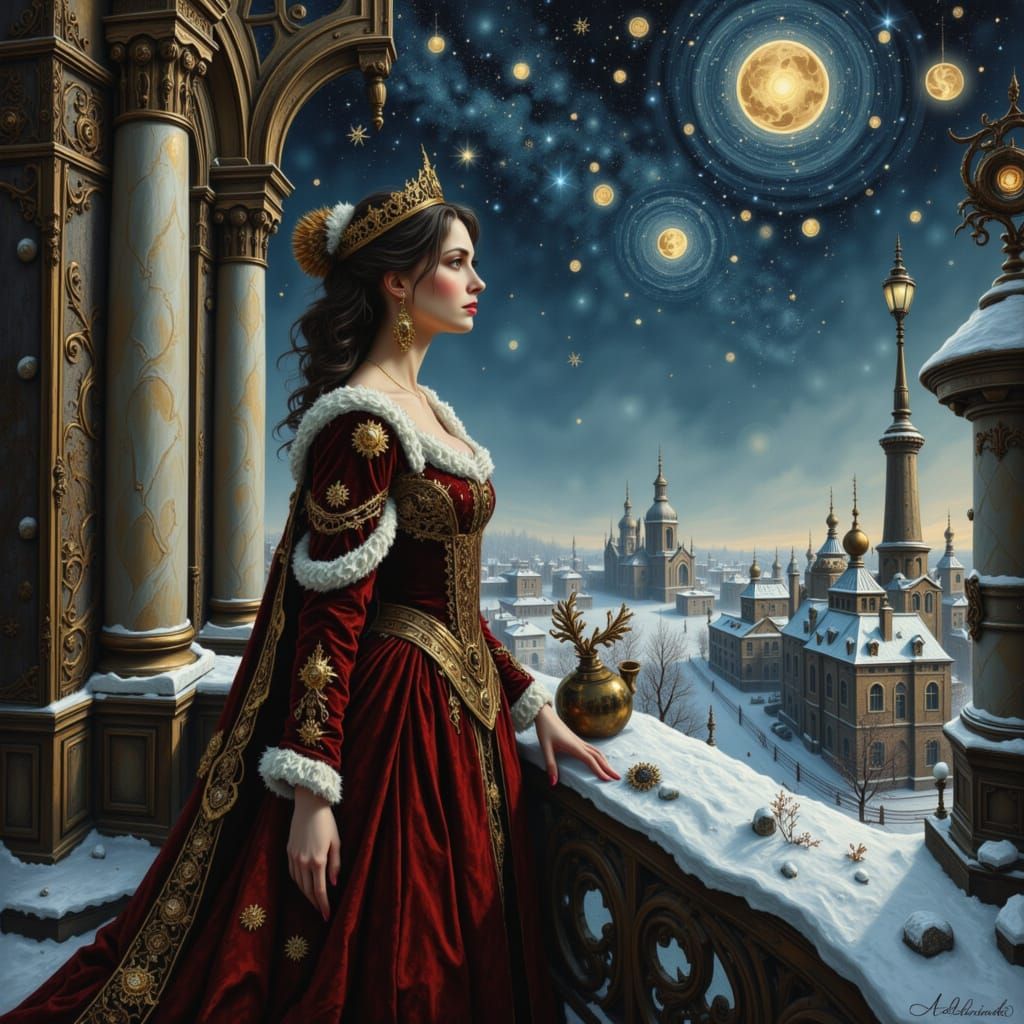 This image shows a Tsarina in rich clothing, gazing from a balcony over a snowy St. Petersburg. The portrait is rendered with dramatic lighting and baroque architectural details in a steampunk aesthetic.