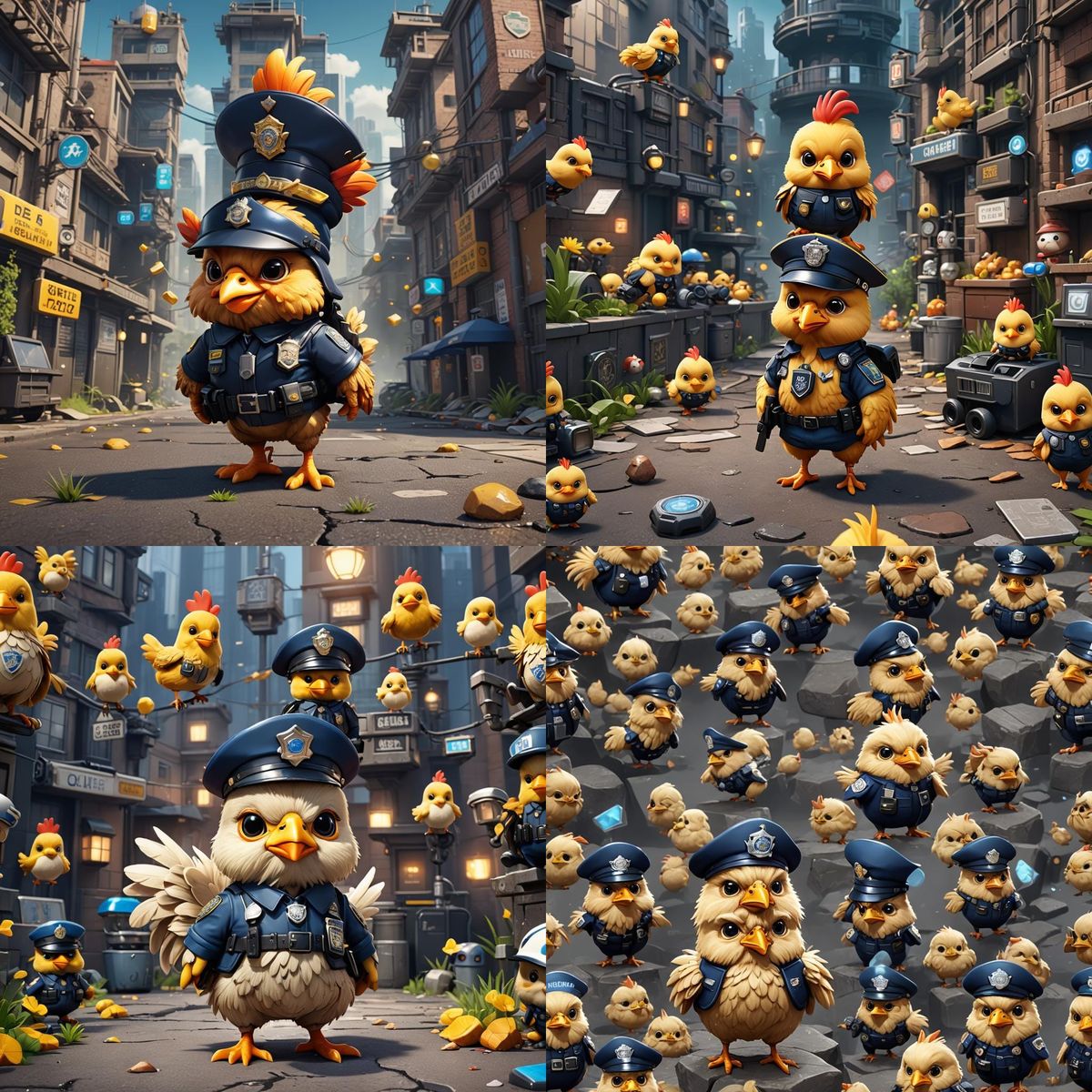 This image shows a cartoon chicken dressed as a police officer. The digital painting features deep colors and intricate details, creating a fantastical concept art piece.