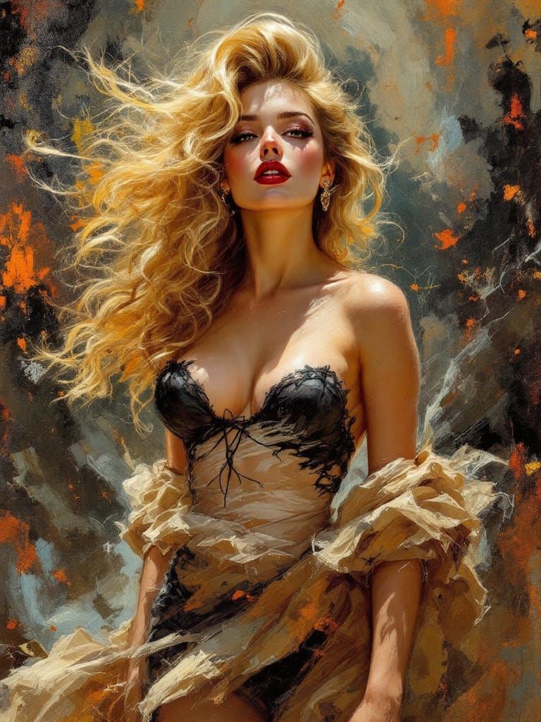 This image features a full-body depiction of a 1950s pin-up woman with direct eye contact, rendered in a vigorous impasto style with dramatic chiaroscuro and warm, golden illumination against stormy depths.