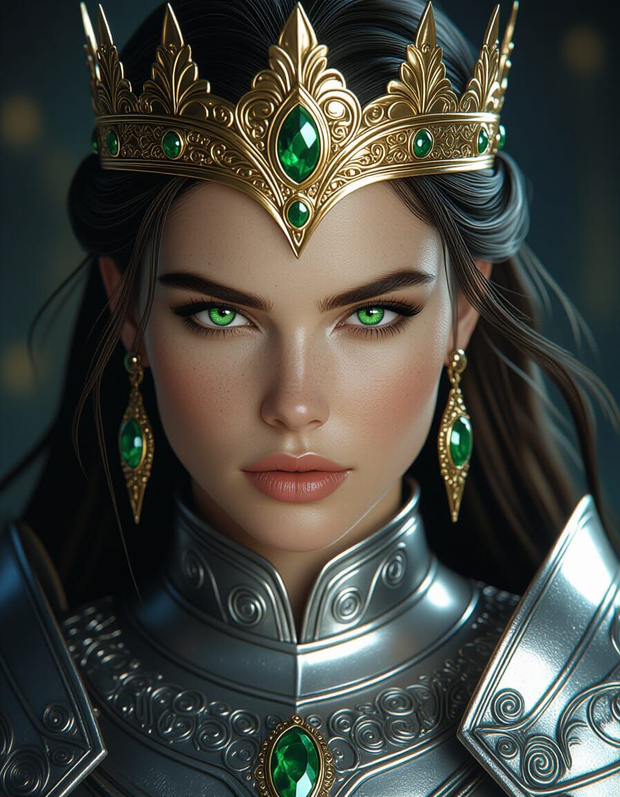 A highly detailed portrait of a warrior queen featuring silver armor, emerald eyes, and a golden crown, presented in a dramatic, cinematic style with sharp focus.
