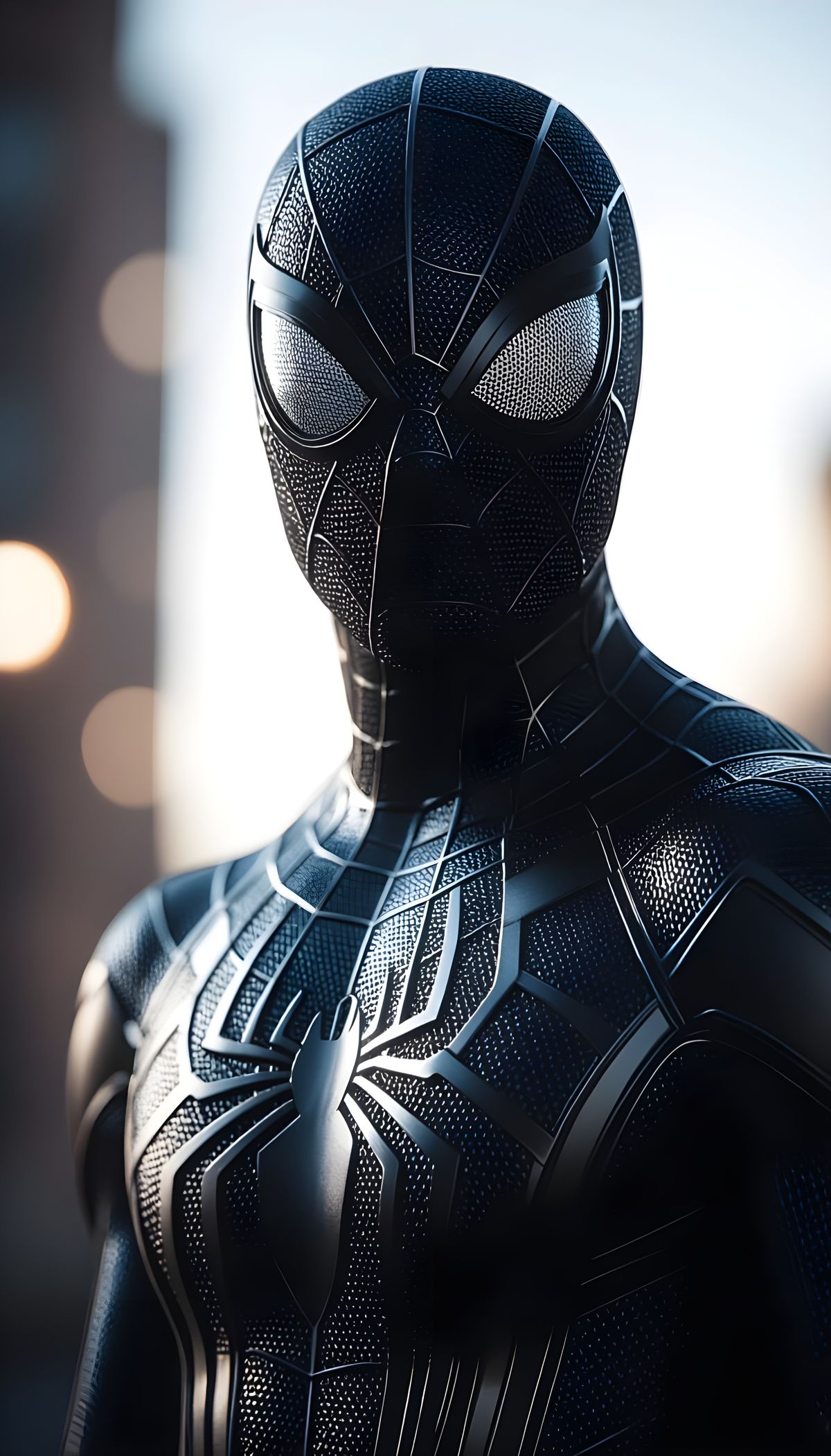 This image is a dramatic, atmospheric cinematic film still of Black Spiderman. It features stunning, high-quality visuals with a focus on detailed lighting and a classic film grain effect.