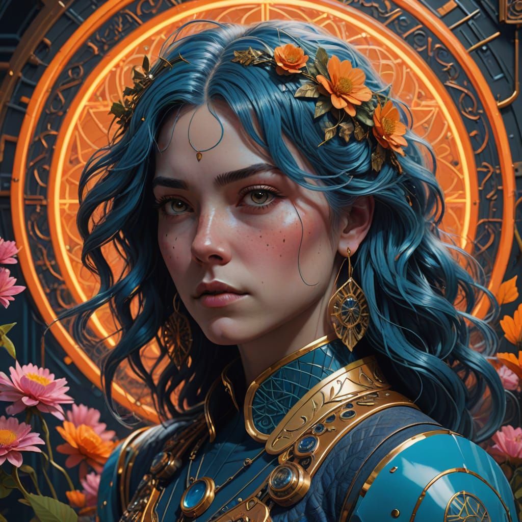 This image features a close-up of a woman with wavy blue hair and a glowing halo, set amidst intricate floral and geometric patterns against a vibrant, glowing background. The photorealistic portrait showcases rich colors and detailed textures, with a serene and regal expression.