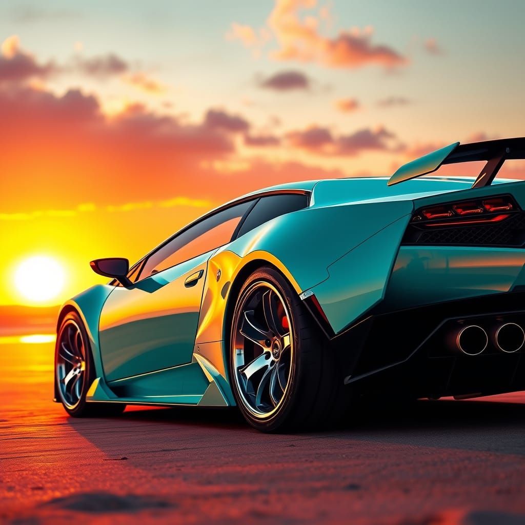 A hyperrealistic image of a turquoise Lamborghini parked on a beach at sunset. The car's sleek design and chromed wheels reflect the warm, golden light in a digital art style.