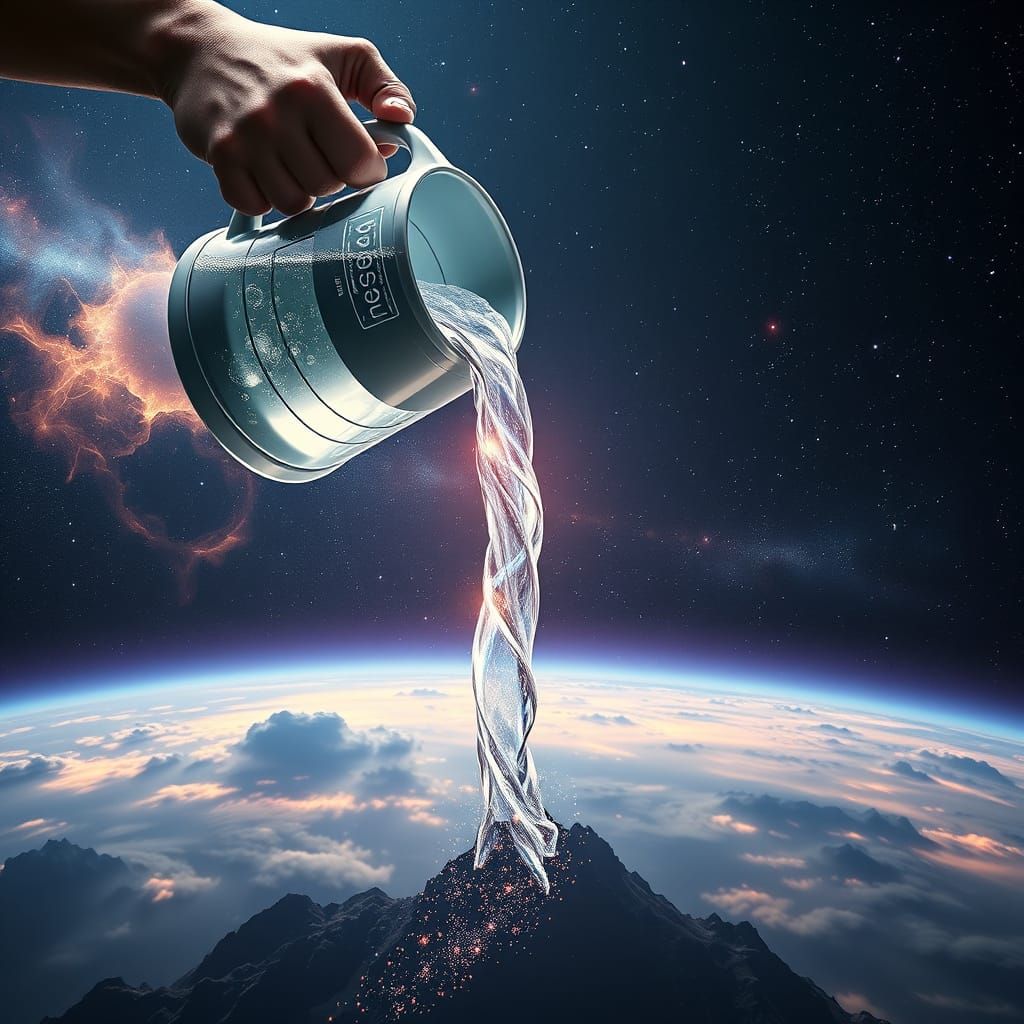 This image shows a dramatic cosmic scene where a human hand pours a shimmering stream of iridescent light into a deep space nebula, surrounded by distant galaxies. Created in photorealistic style.