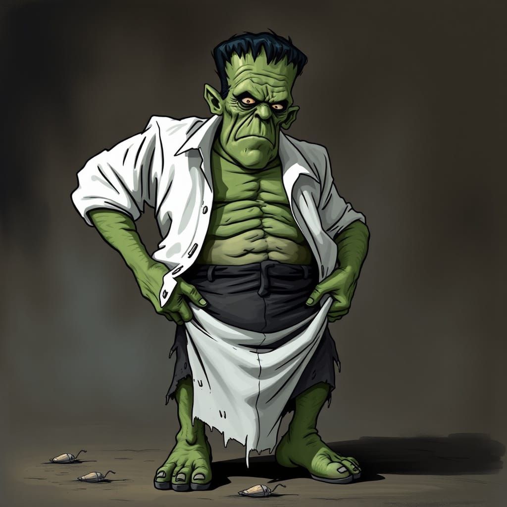 This image depicts a comedic moment of embarrassment for Frankenstein's monster, with his face turning beet red and his pants falling down, in a style reminiscent of classic cartoons and whimsical illustrations.