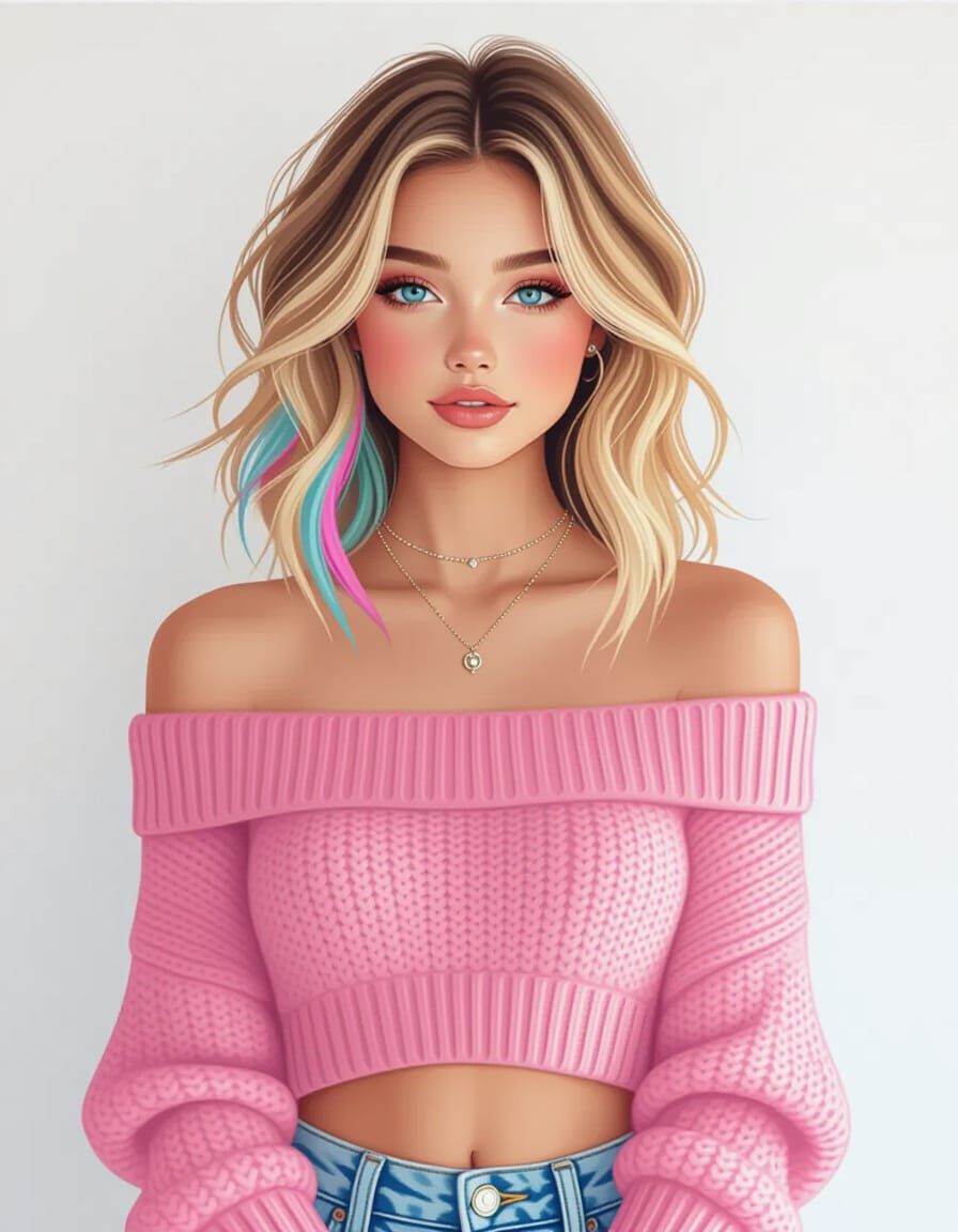 This image shows a young girl with striking blue and pink ombre hair, wearing a pastel pink top and delicate necklace. The digital art aesthetic evokes a modern, stylized character portrait.