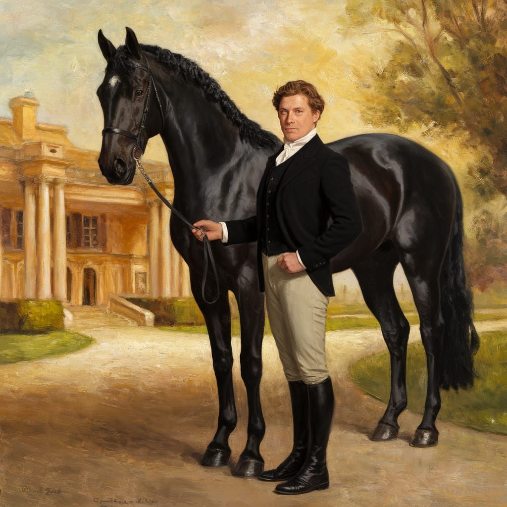 This oil painting captures a proud gentleman and his gleaming black horse, set against a warm, golden backdrop of a stately home, reminiscent of a Constable landscape.