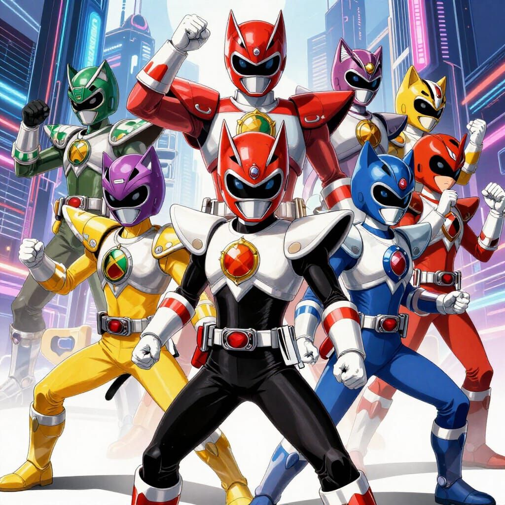 This image features a team of colorful feline heroes in dynamic action poses, set against a futuristic city. The art style is inspired by high-quality Japanese anime and manga visuals.