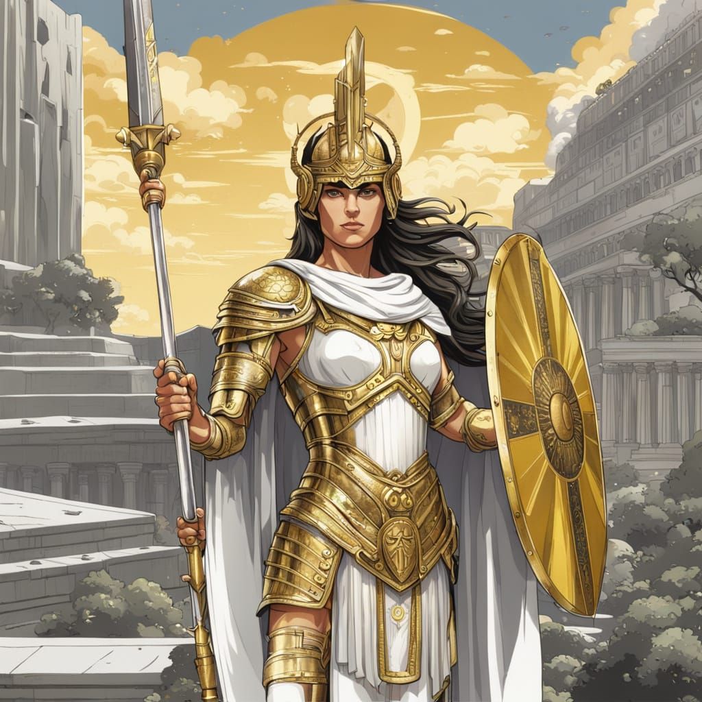 This image depicts the goddess Athena in futuristic gold and white cybernetic armor, armed with her shield and spear, standing as a sentinel over the ancient city of Athens.