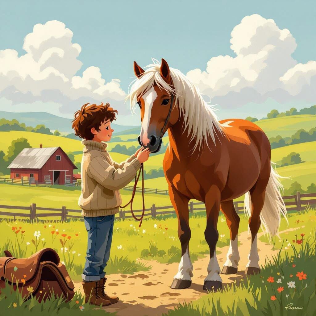 This image shows a young person grooming a horse in a peaceful countryside setting with rolling hills and a rustic barn. The scene is rendered with vibrant colors and whimsical details in a heartwarming Disney style.