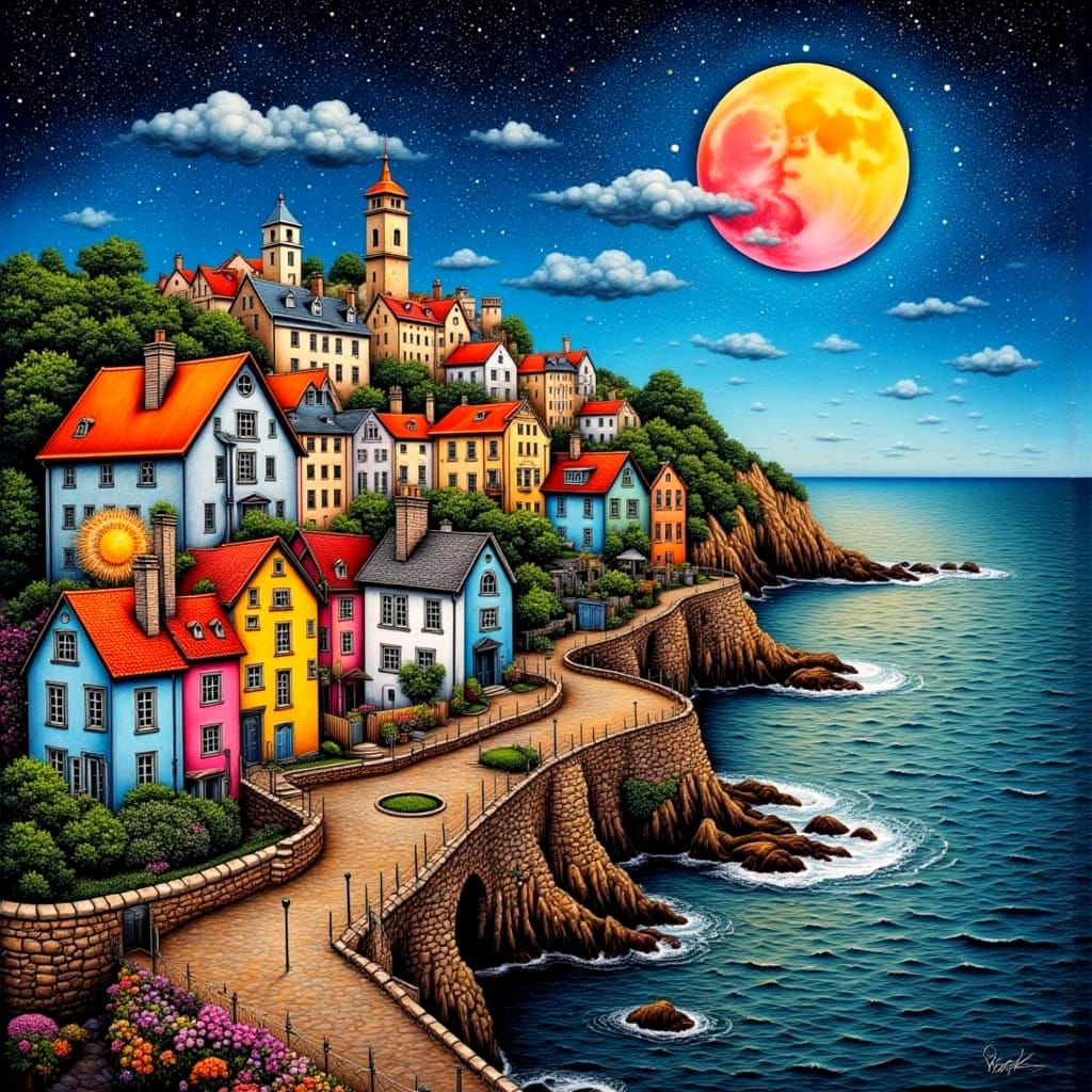 This image shows a vibrant folk art depiction of a Cornish town at night. The town is nestled on a hillside with a full moon over the ocean, rendered as a colorful mixed media collage.