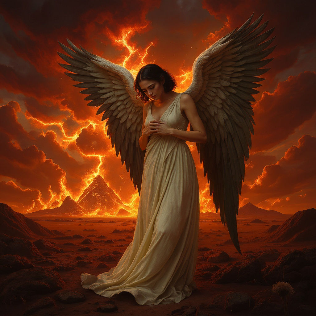 This image shows an angelic woman with sad eyes and a broken heart, seemingly burdened by the weight of the world. The artwork evokes a sense of sorrow and compassion.