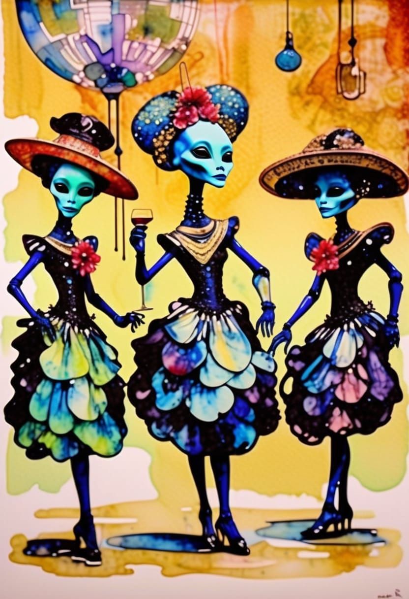 A whimsical humanoid alien performing the cancan in a Star Wars-style cantina. This image combines alcohol ink and rapidograph techniques in a semiotic style.
