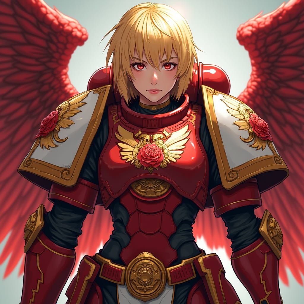 A striking image of a blonde female Space Marine, clad in bold red and white power armor, adorned with golden rose logos, showcasing her unwavering devotion to Sanguinius. The artwork blends sleek lines with ornate filigree, evoking nobility and reverence, with a rich, cel-shaded aesthetic reminiscent of...