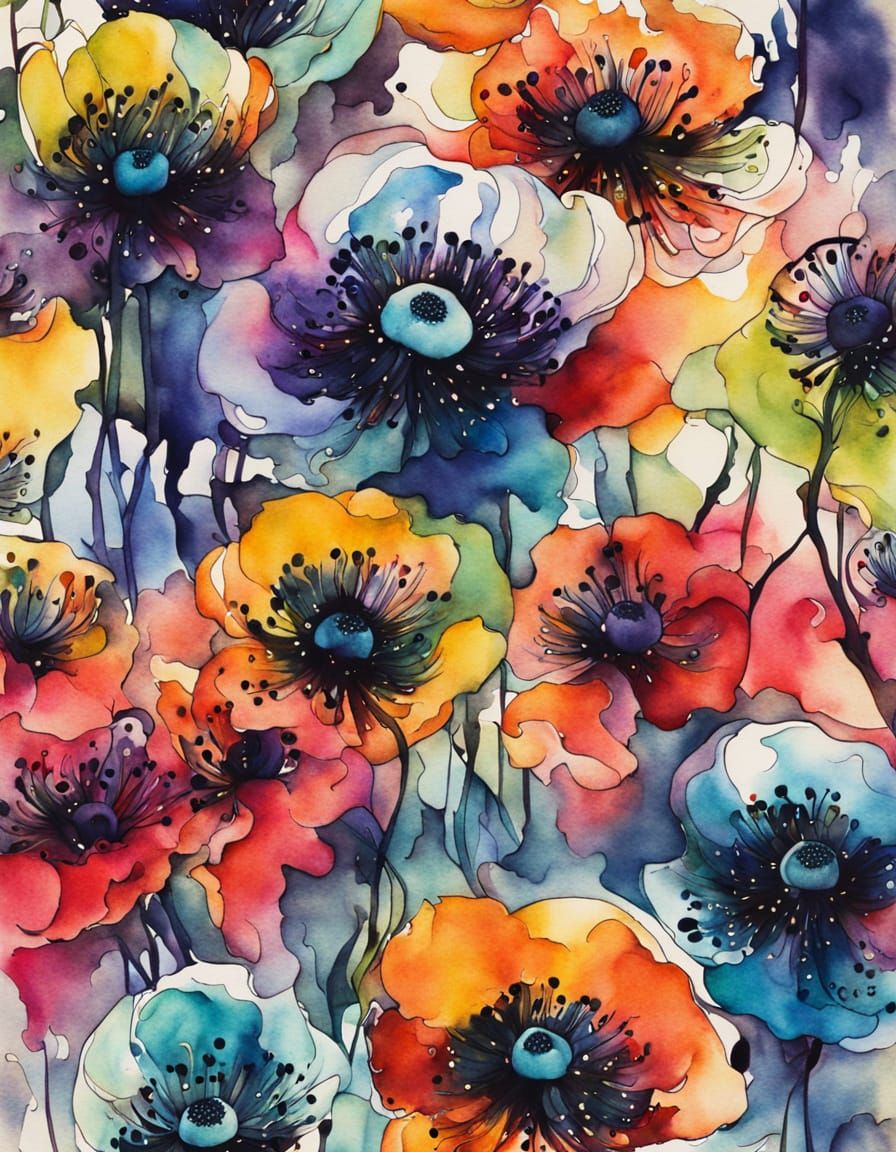 This image shows a close-up of a colorful, graphic anemone in a dramatic, abstract watercolor style, featuring bold brushstrokes and intricate details.