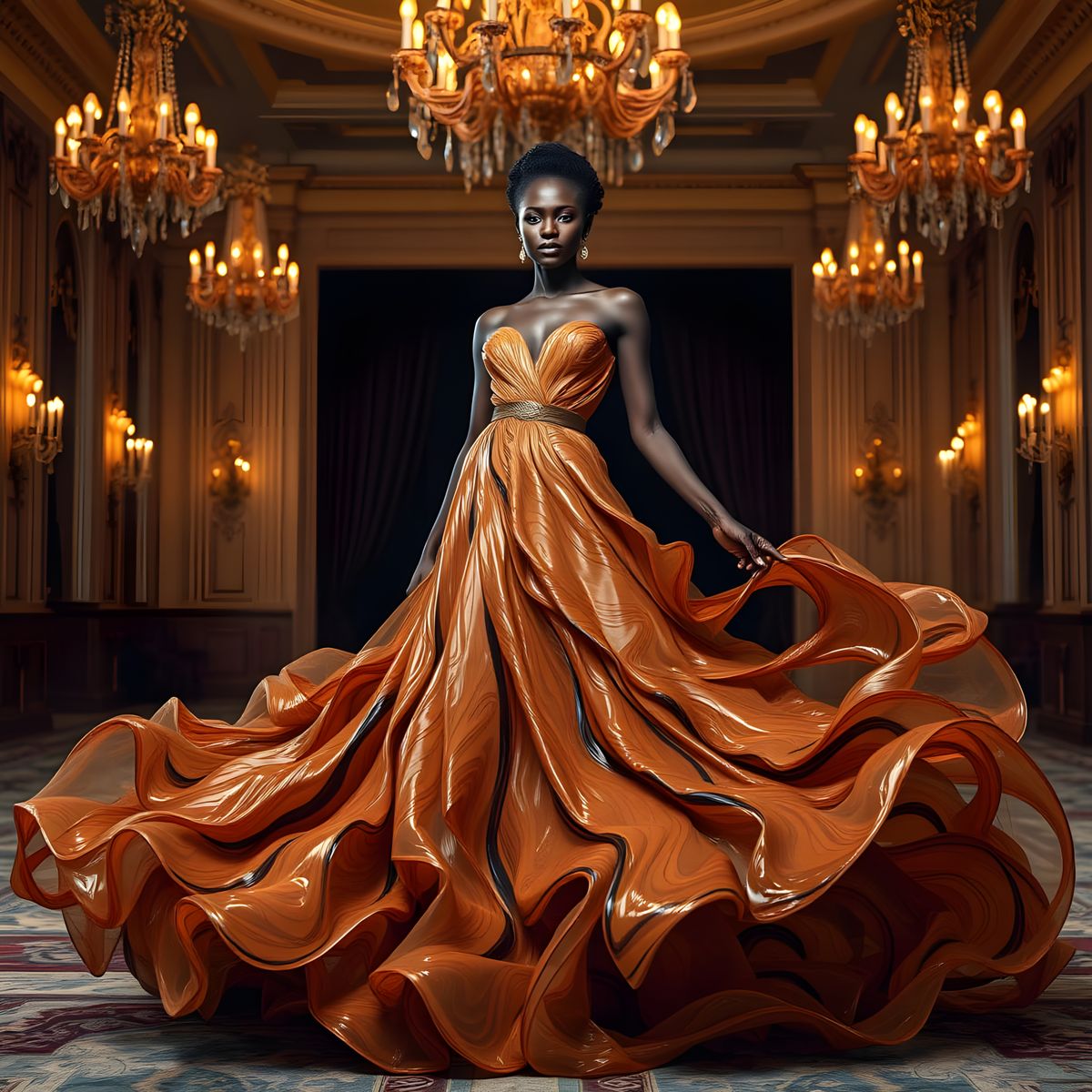 A striking picture of a black model in a ballroom wearing a flowing gown made of swirling coffee. The image evokes surreal high fashion photography with vibrant colors and intricate details.