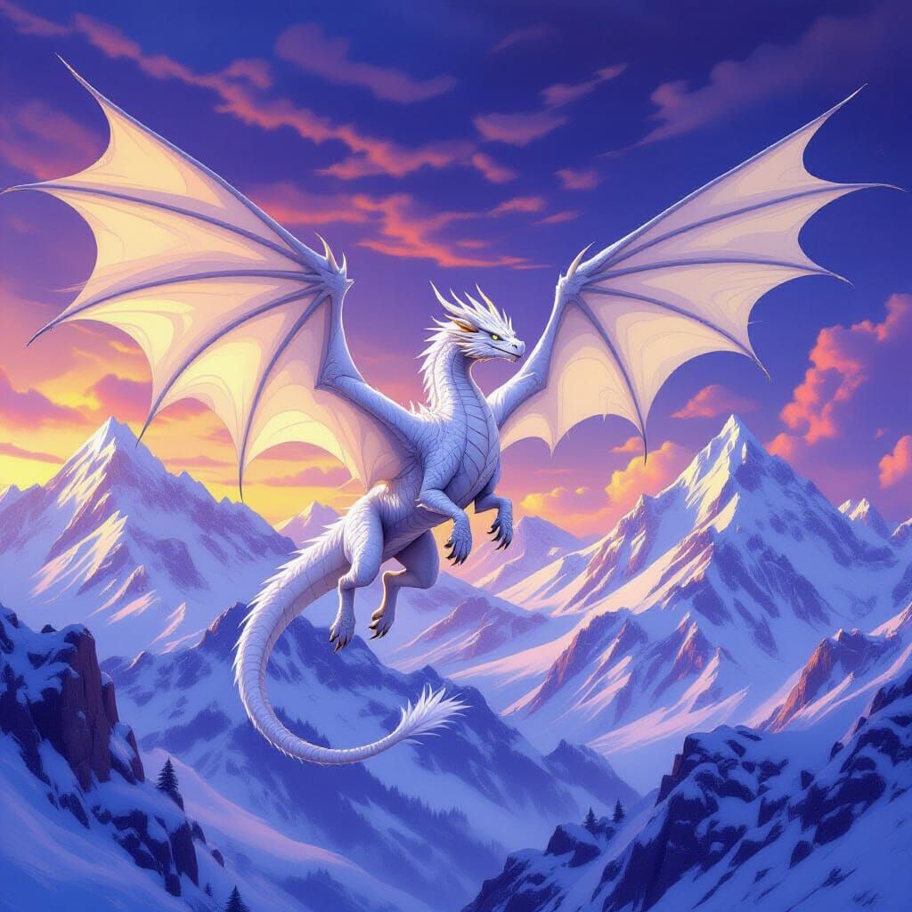 A magnificent white dragon flies through a snowy mountain range. The fantasy art style features dynamic lighting, detailed textures, and a vibrant color palette of purples and yellows. Rendered in 8k.