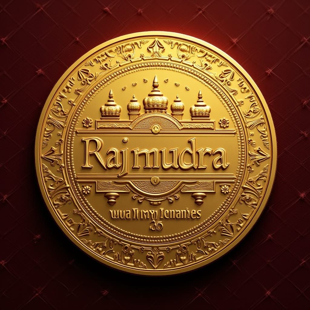 A gold coin design featuring Indian royal heritage, displayed against a velvet maroon backdrop. The coin showcases Maratha-style detailing and Indian motifs with light-reflective highlights, reminiscent of classical Indian art.