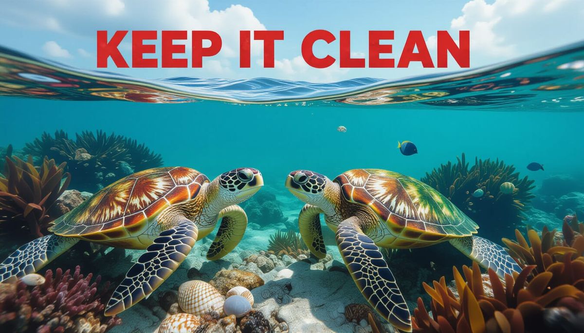 This image shows a sea turtle split between a pristine ocean teeming with life and a polluted ocean full of garbage. The image is cinematic and dramatic.