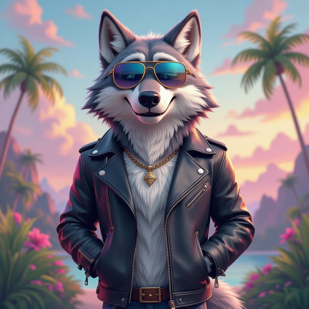 A vibrant image of an anthropomorphic wolf sporting a leather jacket and sunglasses. The wolf stands in a tropical paradise with pink, blue and purple hues, as 3D digital art.