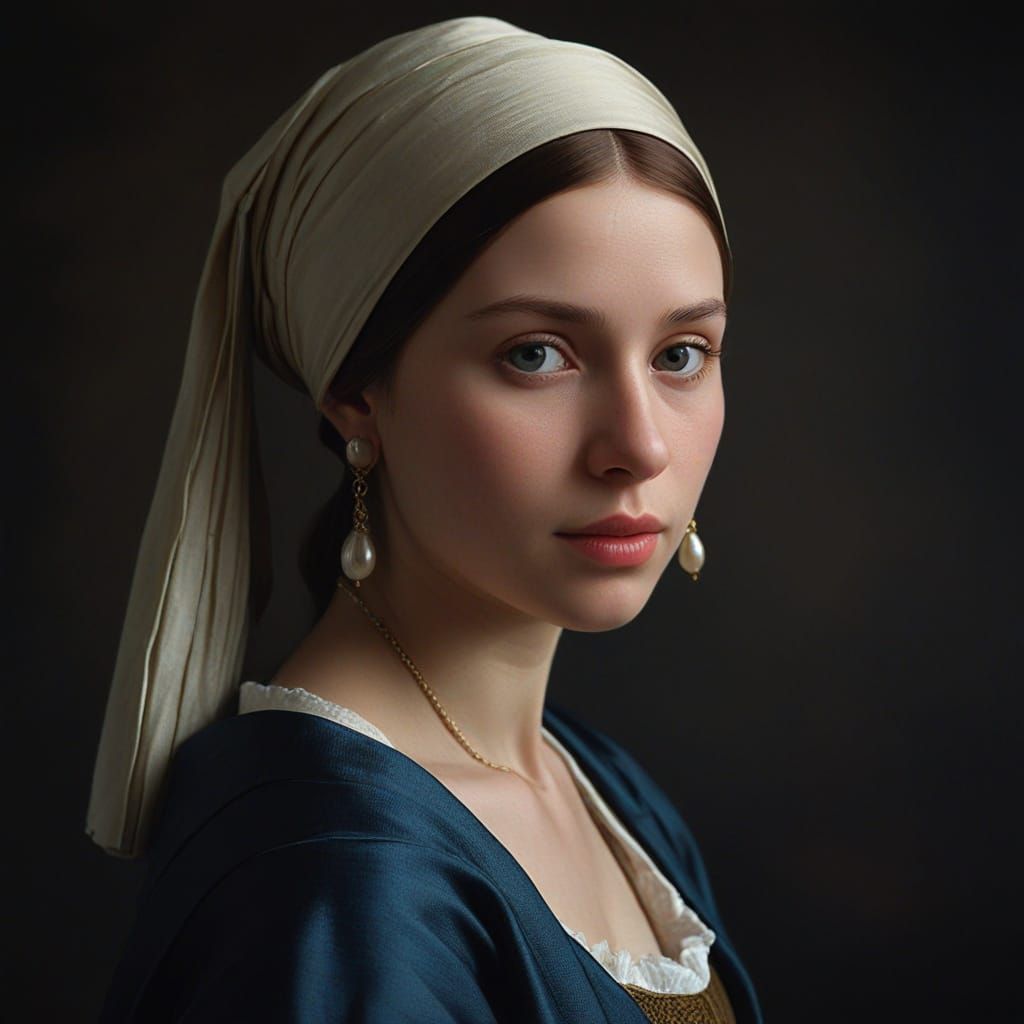 This image shows a young girl with a captivating gaze, adorned with a pearl earring, set against a dark and muted background. The vibrant color palette and soft lighting evoke a sense of serenity and innocence, reminiscent of a cinematic film still.