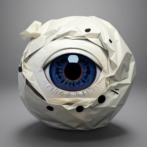 This image depicts an anthropomorphic, fluffy face with popping eyes, conveying a surreal and uncanny aesthetic. The absurd composition features a plastic bag element.
