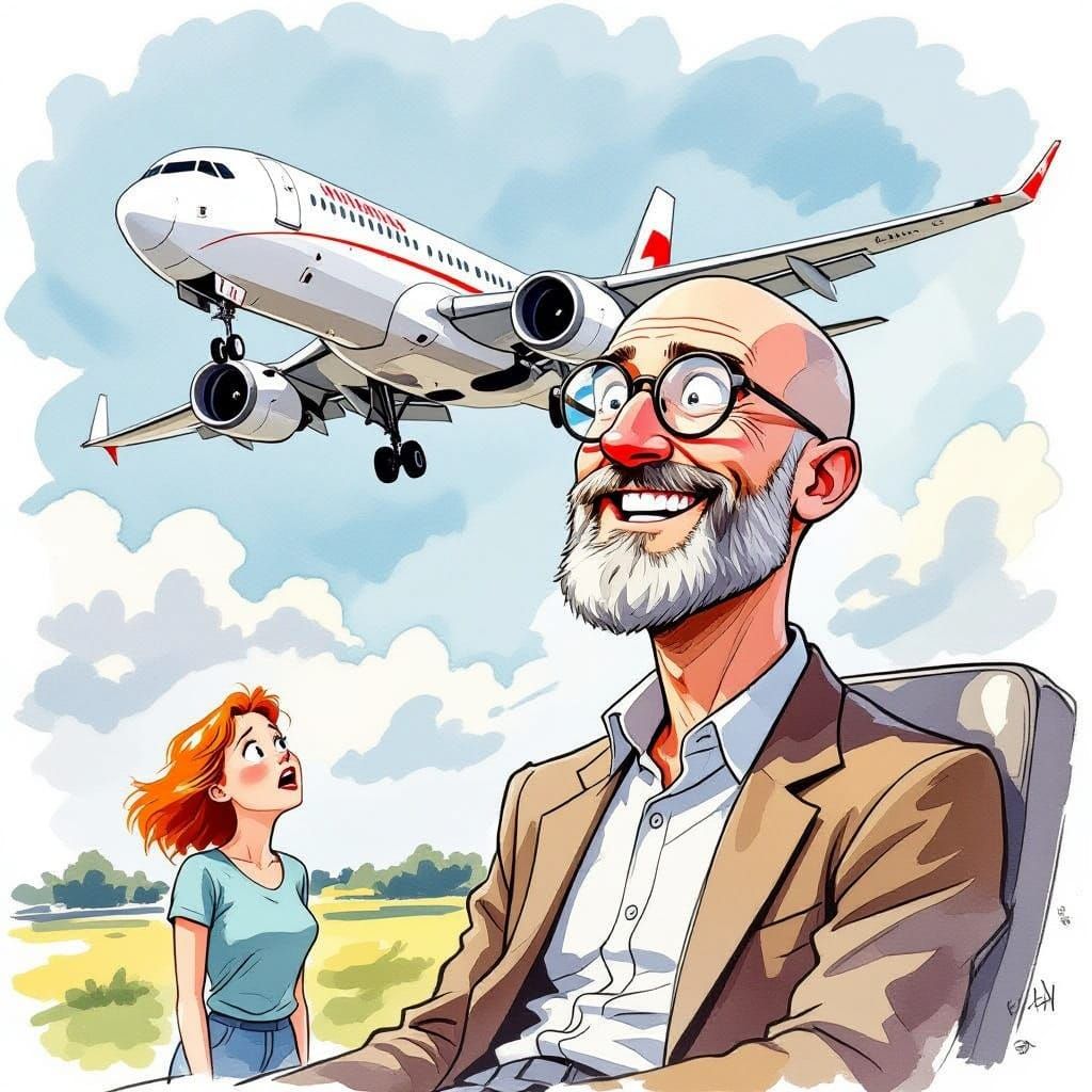 A fantasy scene of a carefree man enjoying a wild plane ride, while a fearful woman watches from the ground, set against a watercolor background with soft, dreamy colors.