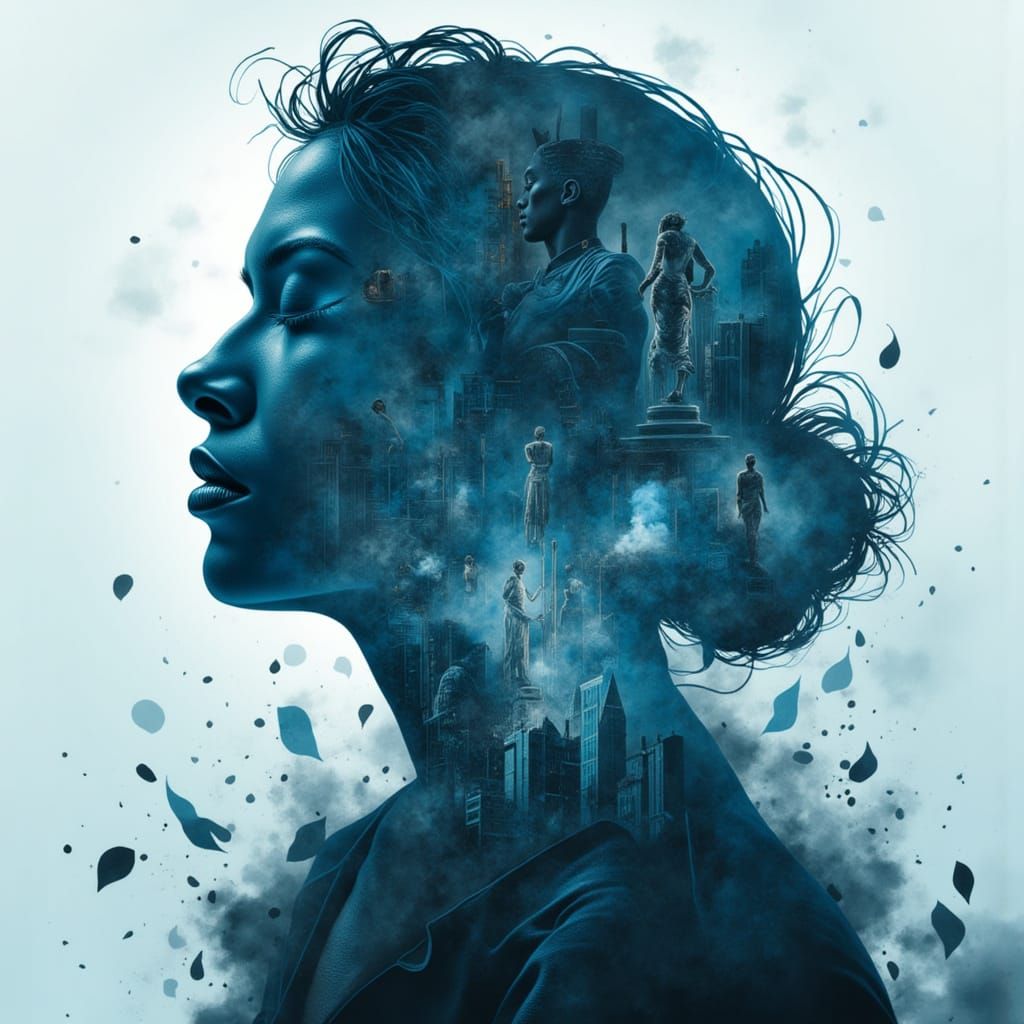 A striking picture of a blue cybernetic silhouette portrait with a synthwave silhouette of a post-apocalyptic cyberpunk world within, creating a double exposure effect. As digital art.