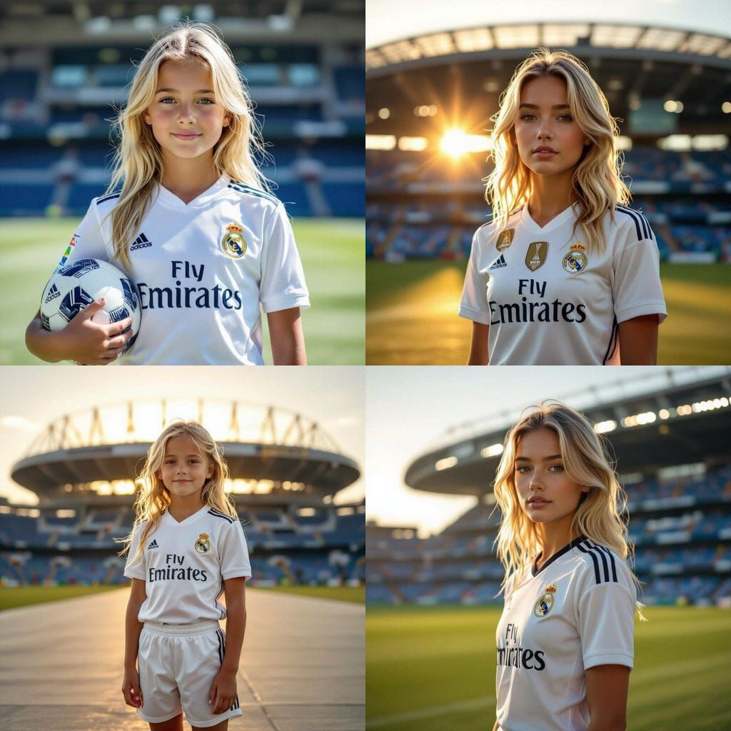 This ultra-realistic image shows a blonde girl in a Real Madrid kit standing outside a football stadium. A stunning depiction of a fan's passion.