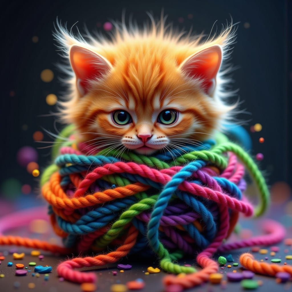 This image shows an irate kitten completely ensnared within a ball of yarn. Rendered as a highly detailed CGI cartoon, the artwork features deep colors and intricate details reminiscent of fantasy concept art.