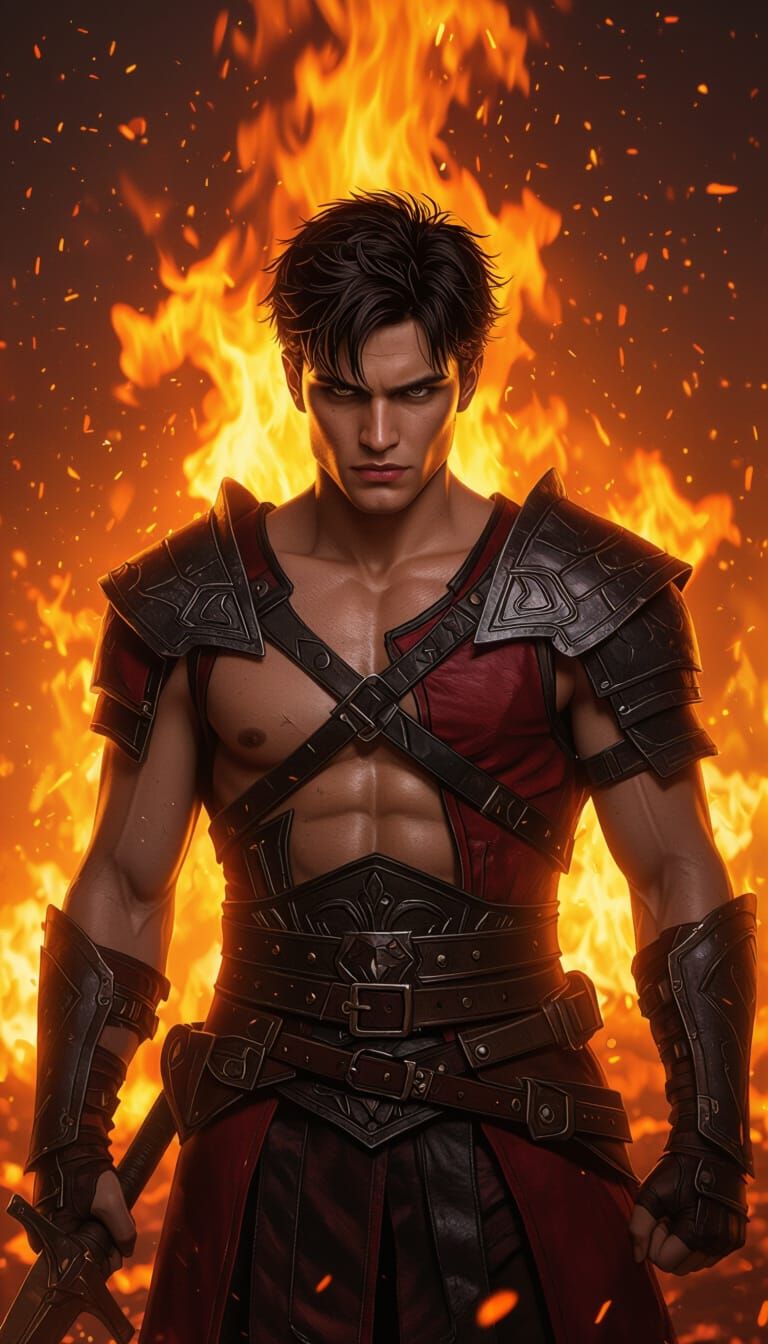 This highly detailed fantasy art shows a determined young warrior centered and illuminated by blazing fire. He wears dark armor and wields a sphere of glowing fire, in a cinematic digital painting style.
