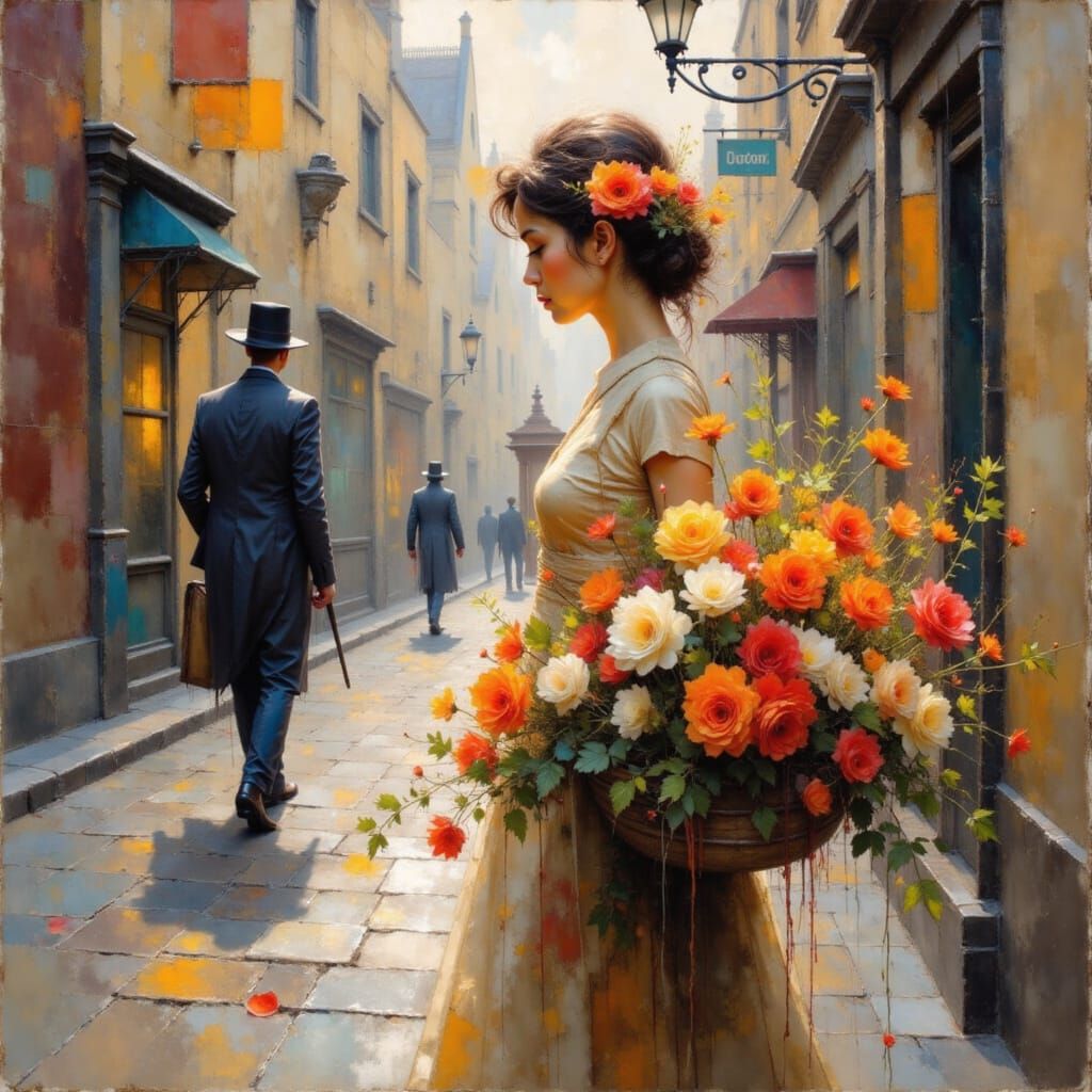 A vibrant portrait of a flower seller on a London street, created with dry brush and oil techniques. The artwork has an elegant and playful feel, reminiscent of classic portraiture.
