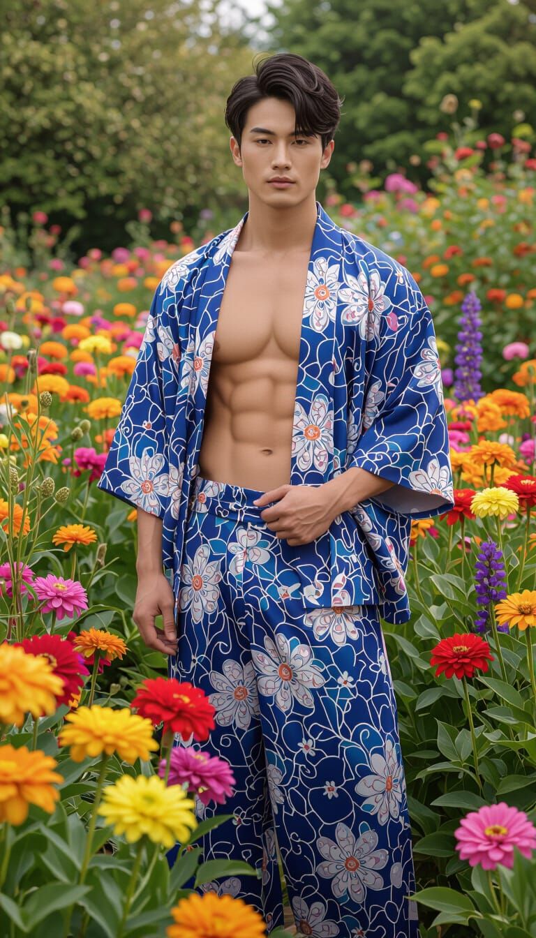 A full-length image of a handsome Japanese man with a stunning physique, posing gracefully in a lush, colorful flower garden. This artwork emphasizes anatomical perfection.